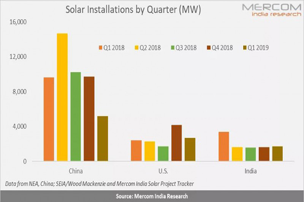 根據Mercom India Research最新發布的2019年第一季度印度太陽能市場更新報告,2019年第一季度印度的安裝量同比下降49%,而2018年第一季度的安裝量為3.4吉瓦 。