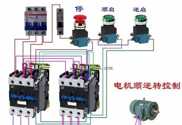 上圖是電機正反轉控制的典型應用,大家看到,斷路器起到了保護電氣過電流、過電壓等作用,但接觸器則根據不同的啟動信號,接通線圈以后來控制電機的工作。